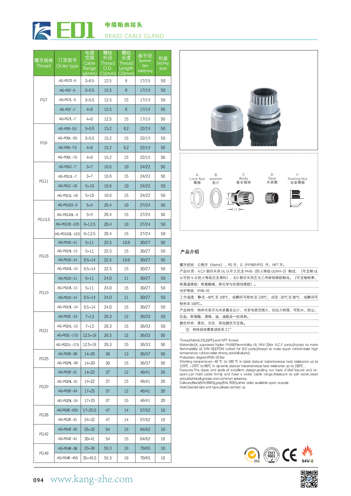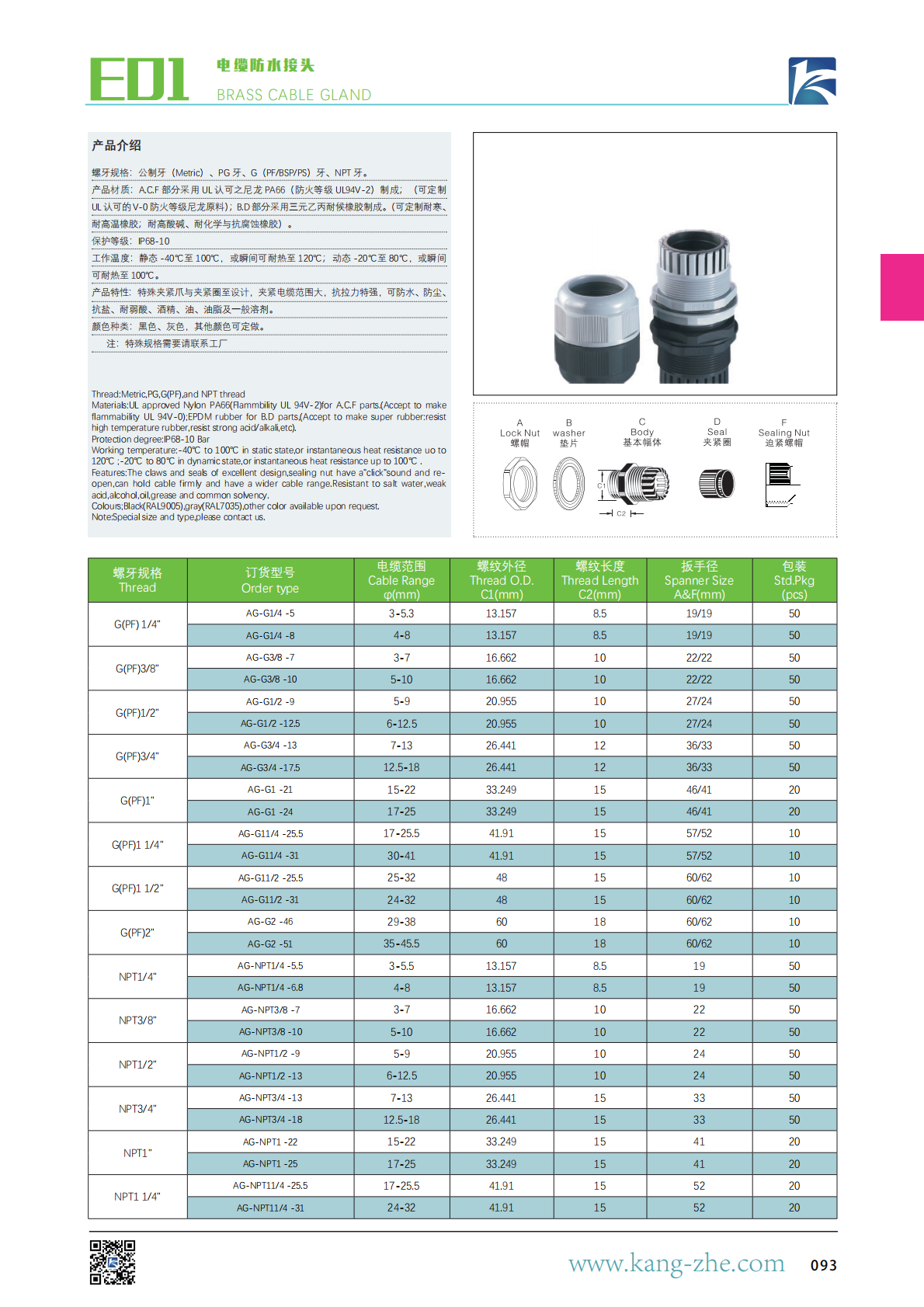 产品材质:A.C.F 部分采用 UL 认可之尼龙 PA66(防火等级 UL94V-2)制成;(可定制UL 认可的 V-0 防火等级尼龙原料);B.D 部分采用三元乙丙耐候橡胶制成。(可定制耐寒、耐高温橡胶;耐高酸碱、耐化学与抗腐蚀橡胶)。