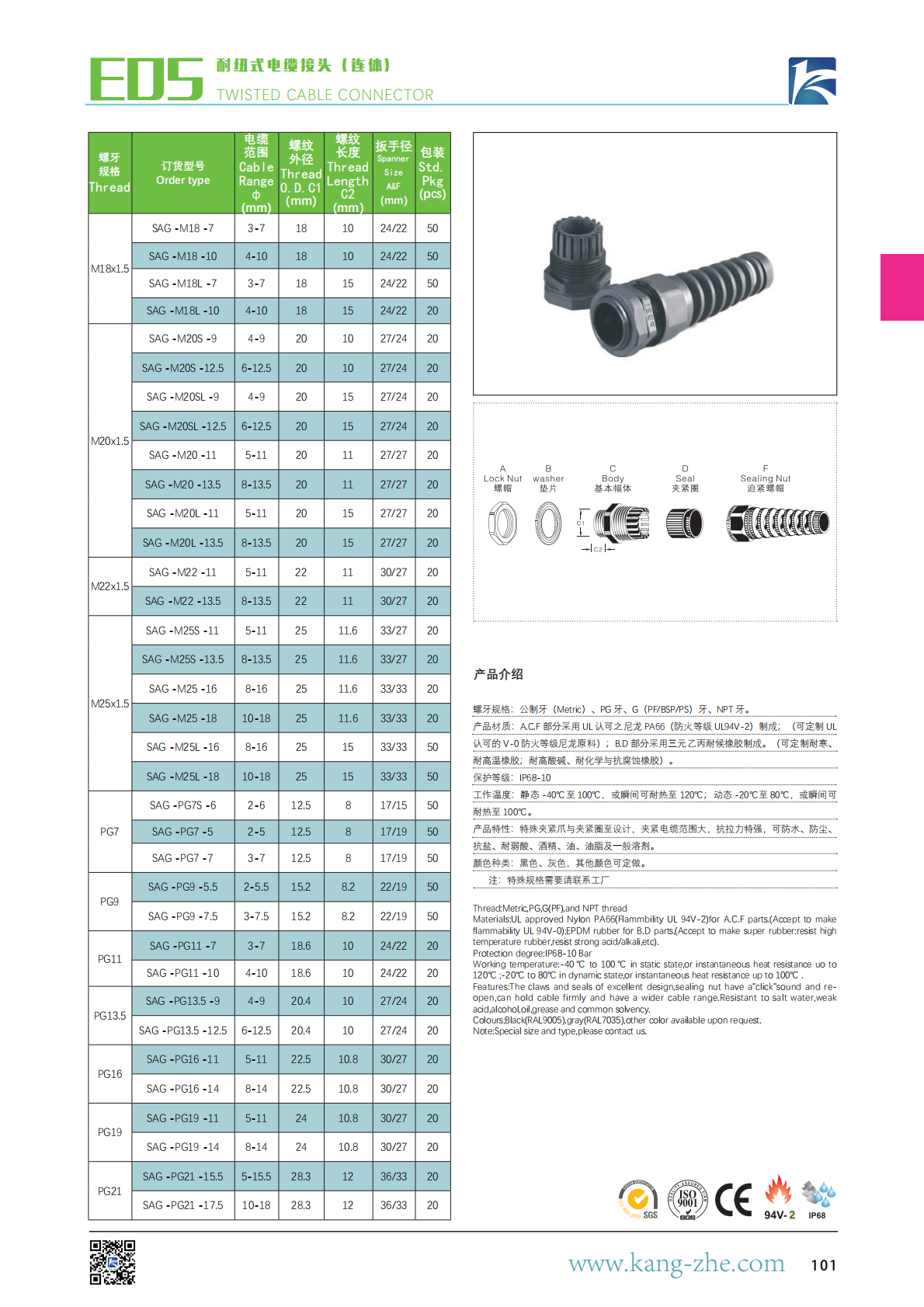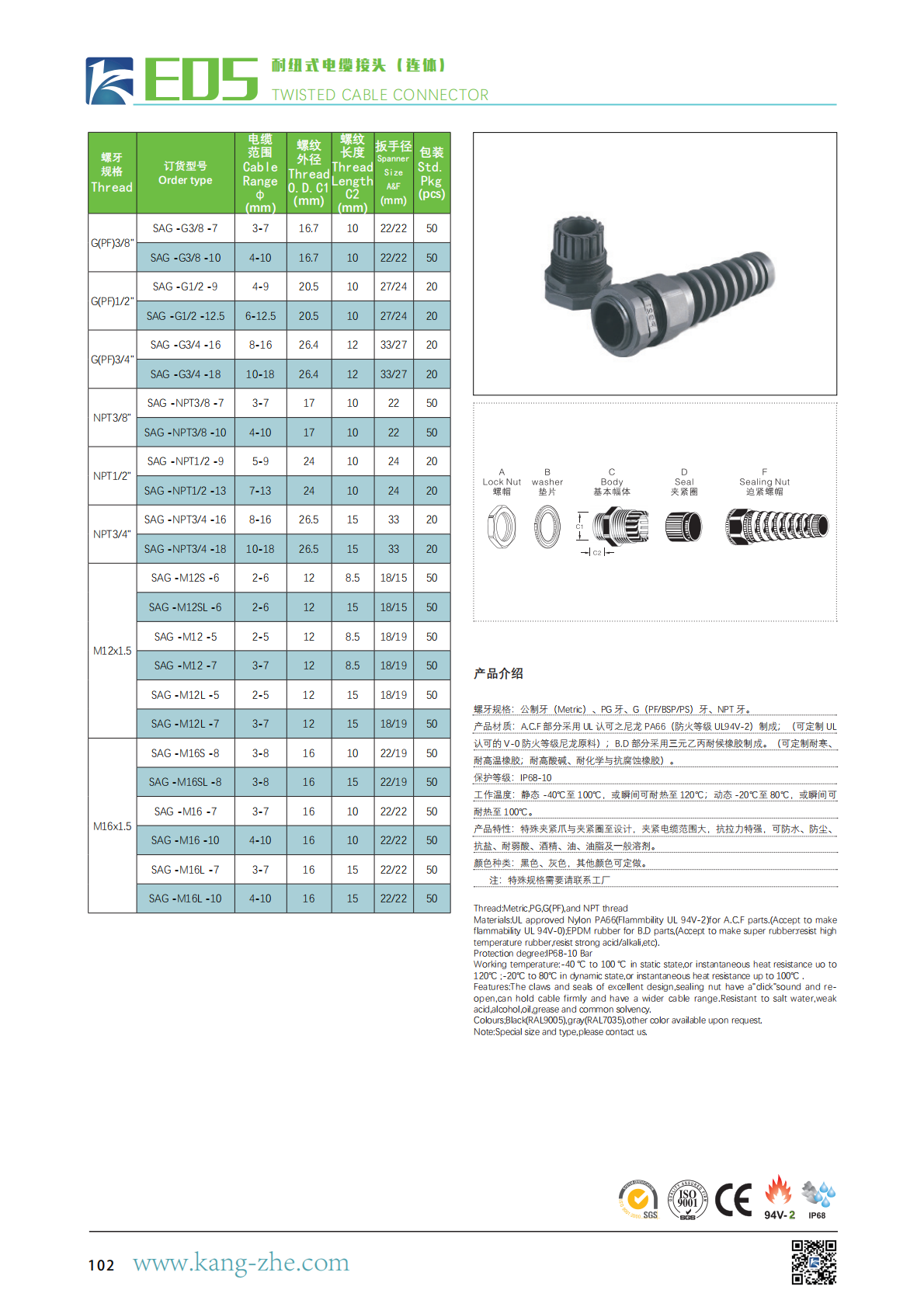 产品材质:A.C.F 部分采用 UL 认可之尼龙 PA66(防火等级 UL94V-2)制成;(可定制 UL认可的 V-0 防火等级尼龙原料);B.D 部分采用三元乙丙耐候橡胶制成。(可定制耐寒、耐高温橡胶;耐高酸碱、耐化学与抗腐蚀橡胶)。