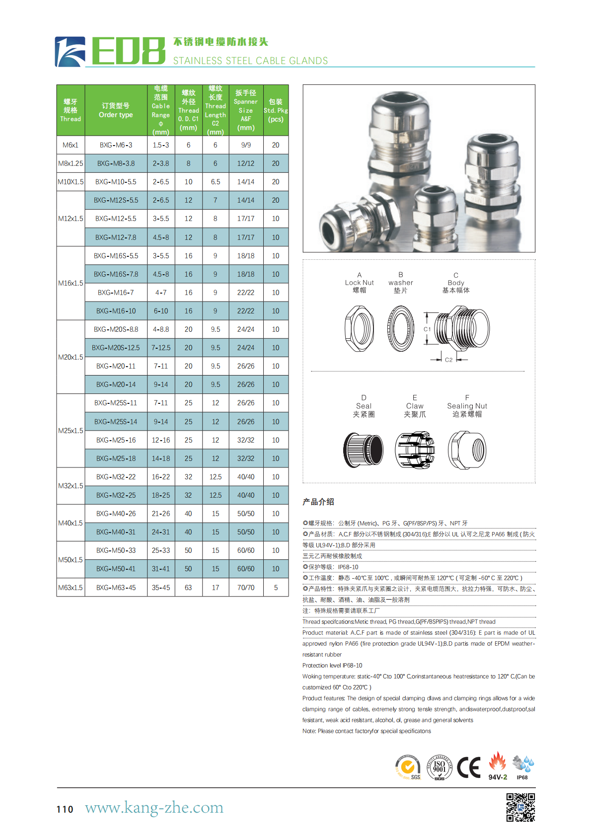 ◎产品材质:A.C.F 部分以不锈钢制成 (304/316);E 部分以 UL 认可之尼龙 PA66 制成 ( 防火等级 UL94V-1);B.D 部分采用三元乙丙耐候橡胶制成