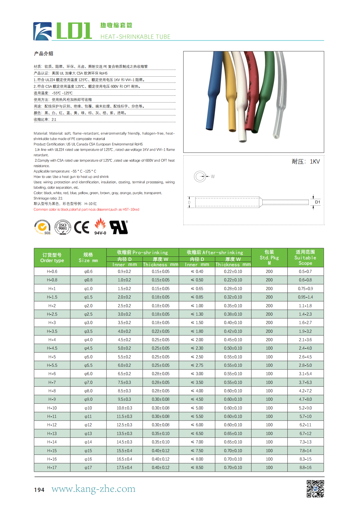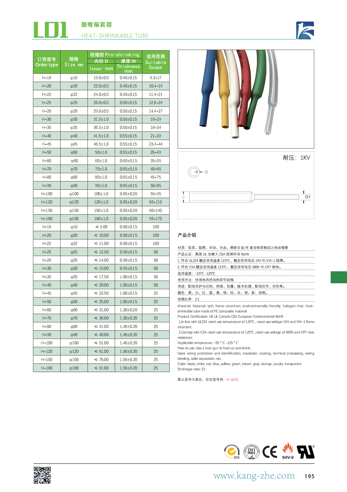 1. 符合 UL224 额定使用温度 125℃、额定使用电压 1KV 和 VW-1 阻燃。